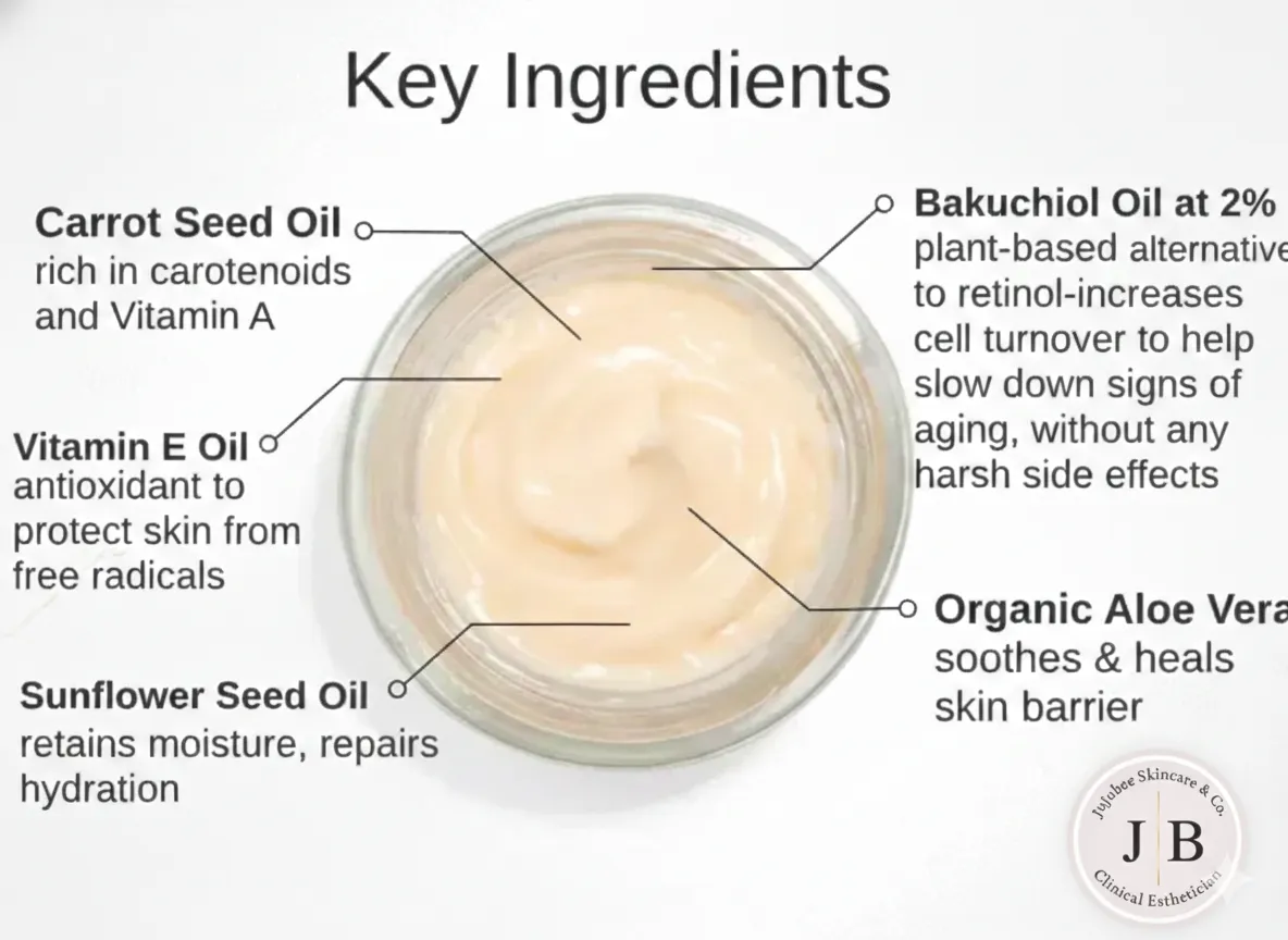 Bakuchiol is a clinically backed, plant-derived alternative to retinol that works gently yet effectively, making it ideal for all skin types, including sensitive and reactive skin. Unlike retinol, it does not increase sun sensitivity, allowing for consistent nightly use without compromising the skin barrier.
